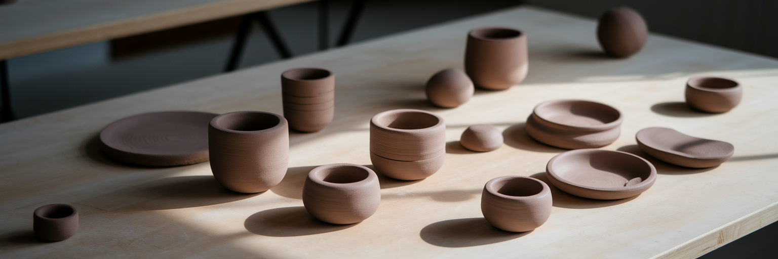 Organized pottery pieces on a wooden table.