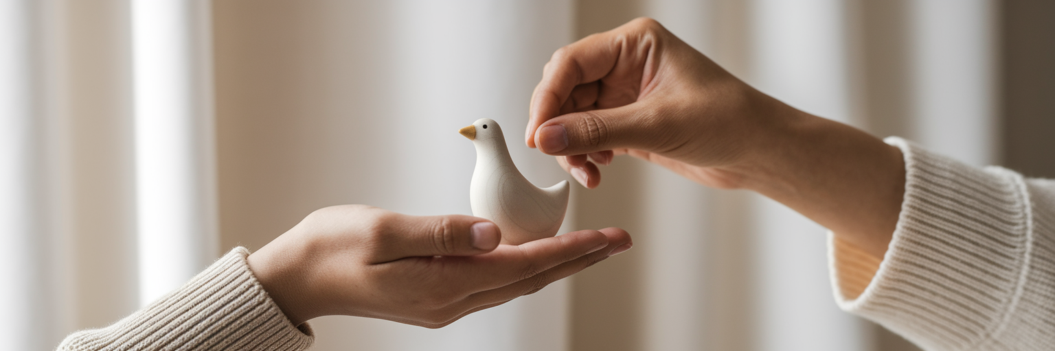 Two hands exchanging a small handcrafted object.